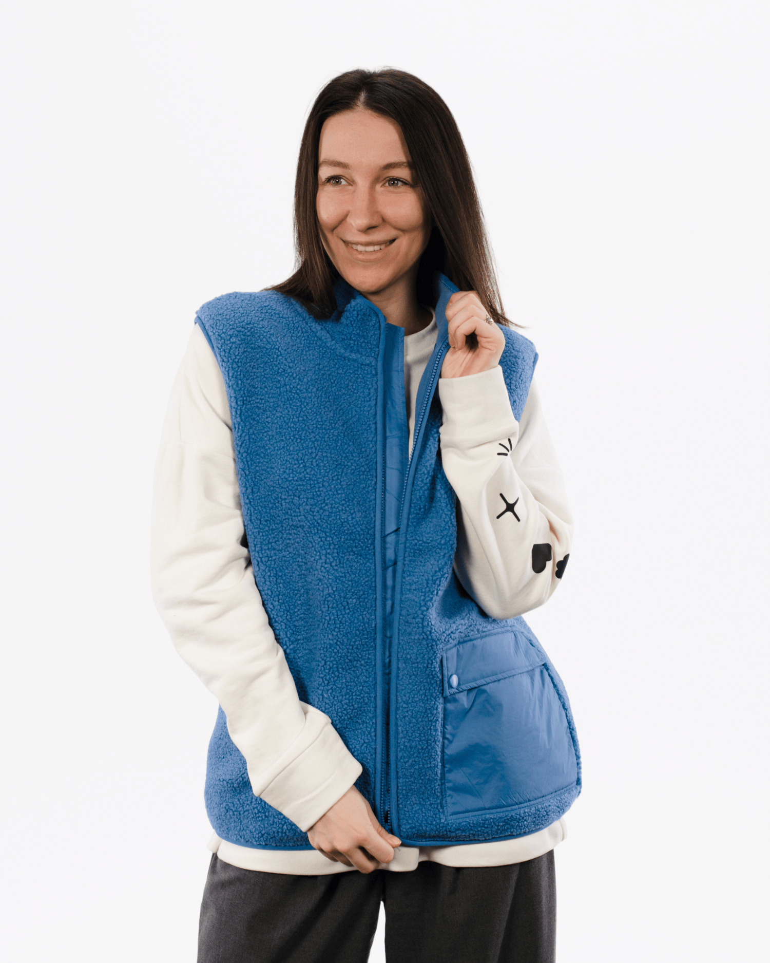 Жилет на молнии из двухслойного материала — искусственный мех снаружи и уютный флис внутри. Накладной карман из гладкого нейлона создает визуальный контраст и делает жилет стильным предметом гардероба.